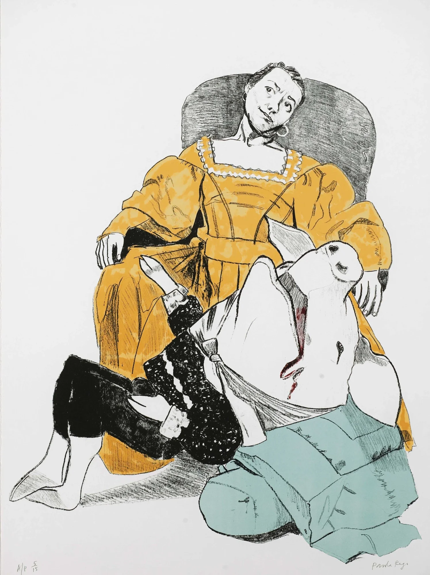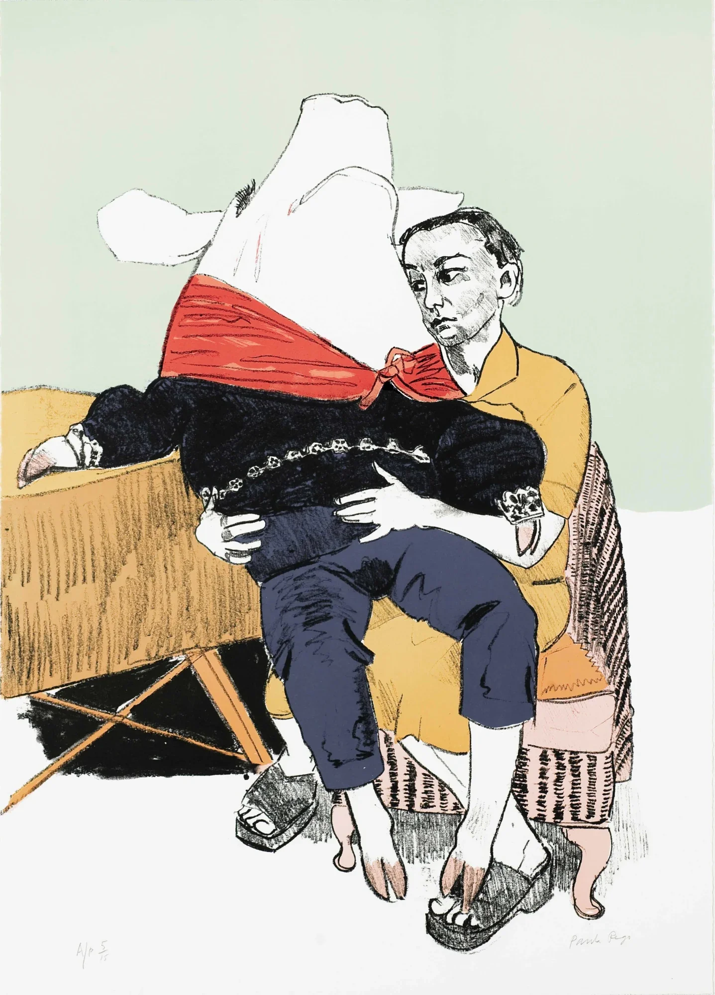 A major catalyst for this period was the connection she found in the work of writer and director Martin McDonagh (b. 1970), whose short stories Rego used as an inspiration to create a series of prints. The playwright’s stories became a channel for Rego to feed her own personal history. Just as Rego several decades before, distorted and updated the classic tales of Peter Pan, Jack and Jill and Humpty Dumpty, the dark, sometimes grotesque, violent, and often tender stories by McDonagh, alongside other tales, saw her embrace narratives that she layered with memories from her childhood in Portugal and later adult life. For the first time she began to make objects, dolls and creatures, described as ‘bonecos’ by Rego, to draw from.