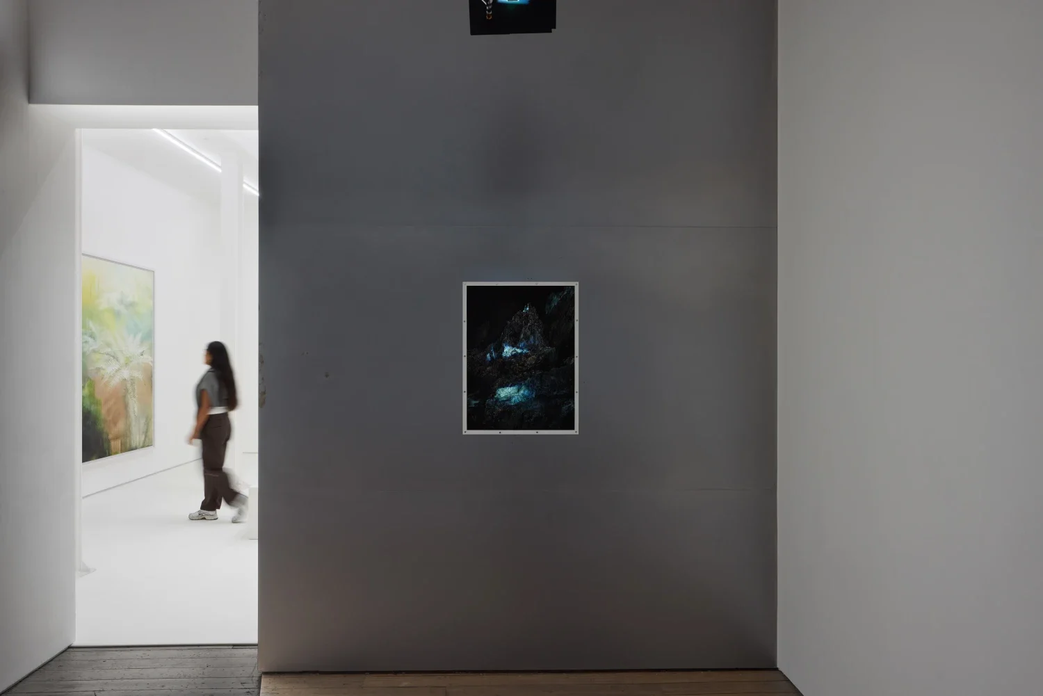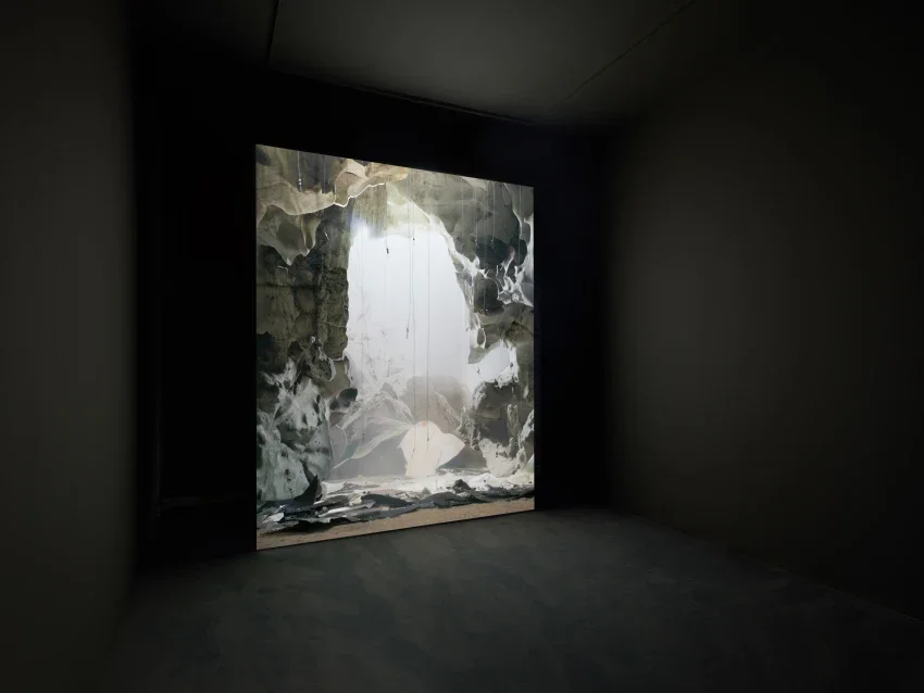 The final room presents Goudal’s 2024 film Grand Vide, commissioned as part of the artist’s Prix Marcel Duchamp presentation. The film depicts a dark, cavernous rock formation that progressively explodes in hypnotic slow motion, exposing piercing shafts of light from within. Goudal delves into the geological and conceptual magnitude of the Great Rift, examining the Tanzanian segment – one of the most visibly expressive sites of the Earth’s continuous deformation. Through a sequence of collapsing staged photographic sets choreographed with theatrical precision and underscored by a visceral soundtrack, the artist simulates the invisible forces of tectonic movement and erosion. The instability of the photographic imagery mirrors the temporality of natural form. Through the use of architectural structures and fabricated landscapes, Goudal blurs the boundaries between the real and the constructed, offering a meditation on the uncertainty that underpins our perceptions of the natural world.