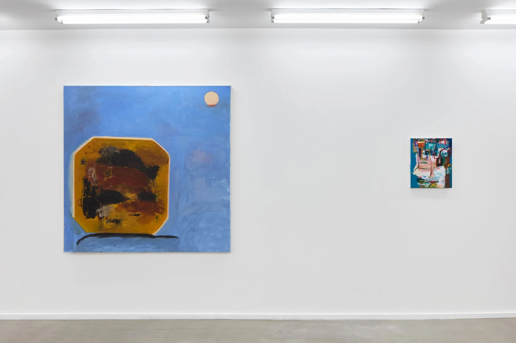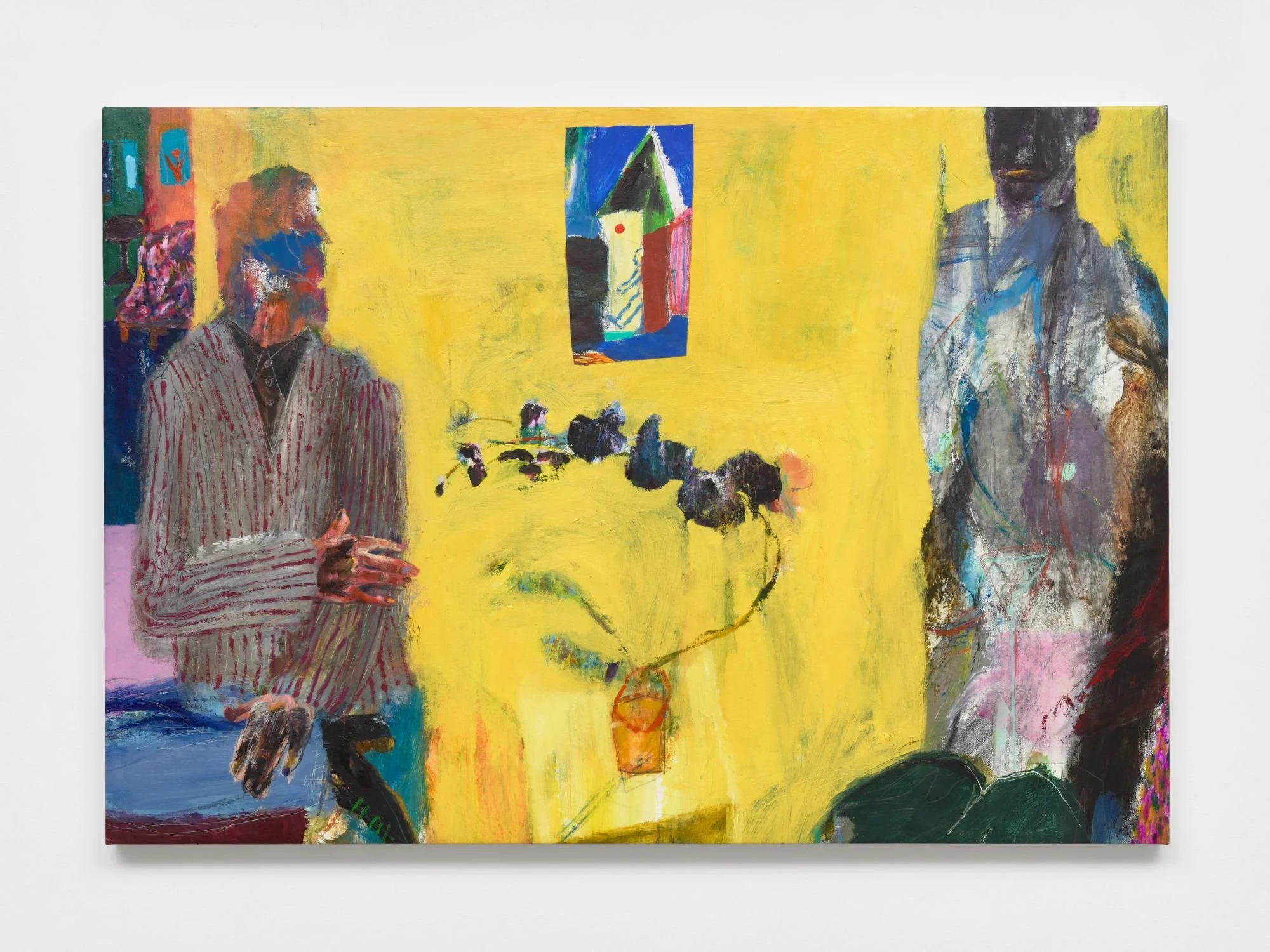 By contrast, Areum Yang holds fast to a representational mode of painting. Her peopled scenes are often set within domestic spaces, resulting from the artist’s interest in the sociocultural conventions of the United States. She stages dinner parties and other interior happenings, grounding them in formal principles that have been established from instinct, habit, and energetic references like Matisse. For instance, Yang’s larger composition is dominated at its center by a yellow side table and canine protagonist. Elsewhere, figures occupy couches or hang ominously in sweeps of pigments. The subjects illustrated aren’t based on photographs or known figures, but rather, informed by affective exploration and the desire to open up personal experience to a universal viewership. These paintings are thus a direct response to life, posing the question: how does one meet the world?