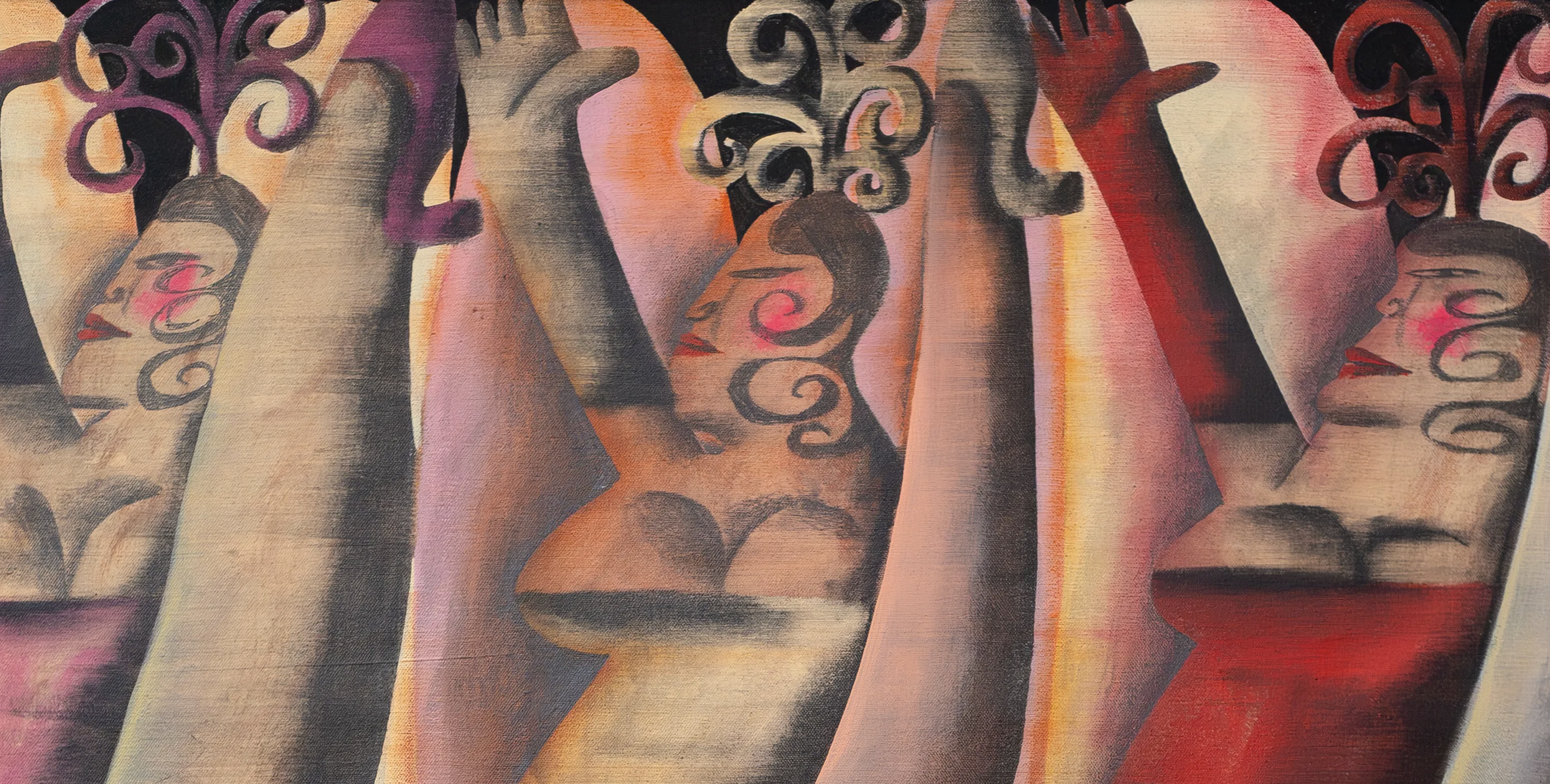 Sabo’s process mirrors the thematic tension embedded in the imagery. Loose sketches are drawn directly onto canvas and washed with thin, airy layers before being worked over in graphite. The surface is then smeared horizontally with matte medium and a broad brush, dragging the image towards near-erasure. Once dry, crisp planes of dark and cream are reintroduced, carving definition from haze. The result is a surface that oscillates between freedom and control — buoyant, strange and quietly defiant.