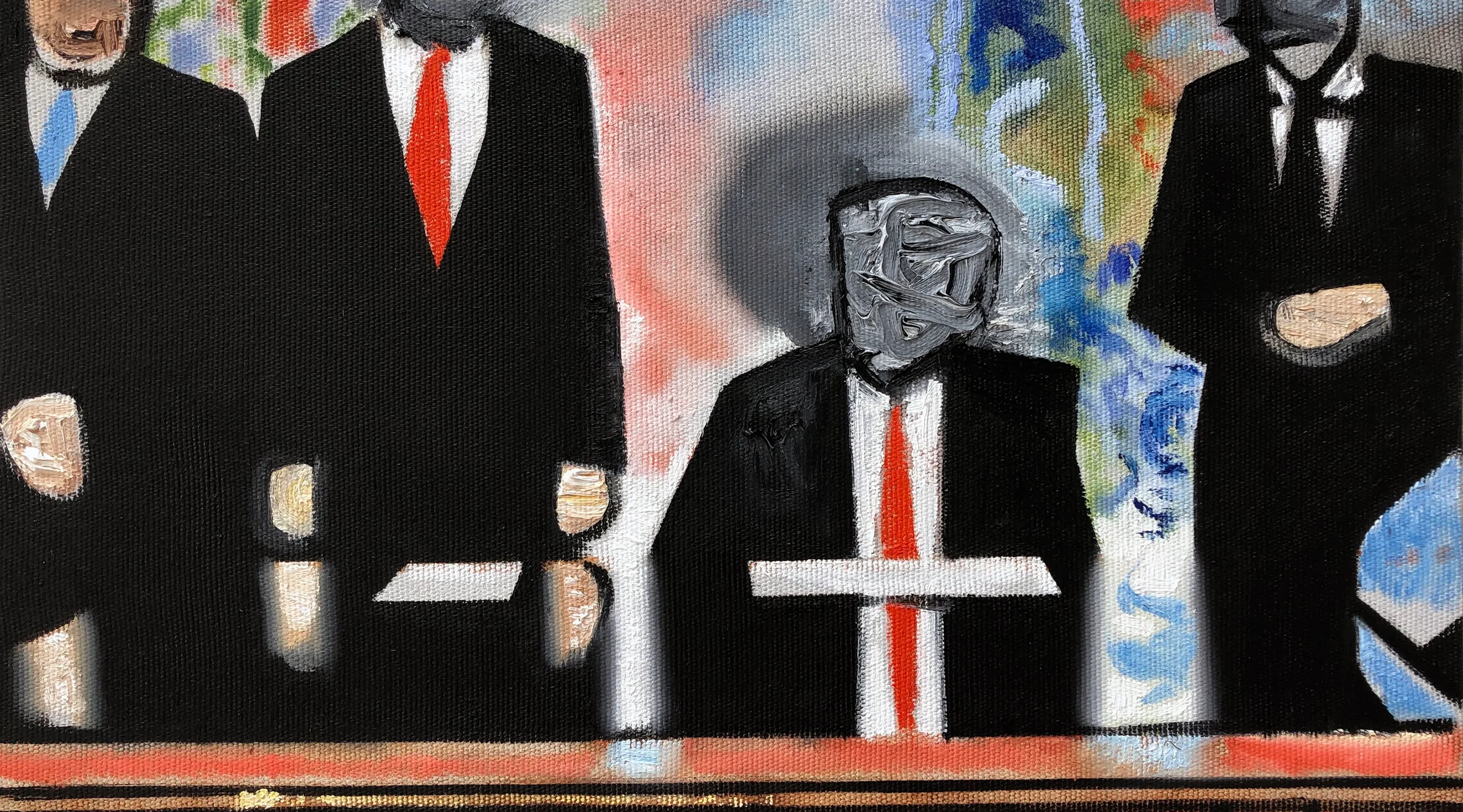 Distinct genres of subject have emerged in Sasnal’s works. Alongside the family portraits in this exhibition, he returns to music, landscape, history and politics with a fervour. The portraits of musicians expand the autobiographical resonance of his paintings, drawing on the subjective ability of an admired artist to conjure a period, a location, or a feeling. Alongside the intensity of fandom and the scenes of family life are studies of the greyed-out faces of politicians and sites of authority, such as the Oval Office and a NATO convention. For Sasnal, the dissected, examined past and present are exchangeable and activate each other, articulated through the direct economy of reductive viewpoint, equally semiotic and sentimental.